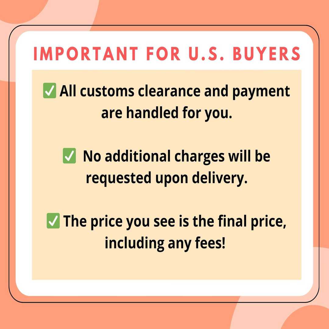 - U.S. Buyers: Starting August 29, new tax regulations require customs duties and paperwork for international orders. Don’t worry 💙—all customs clearance and payment will be handled on your behalf. The price you see is final, including all fees. No extra charges at delivery.