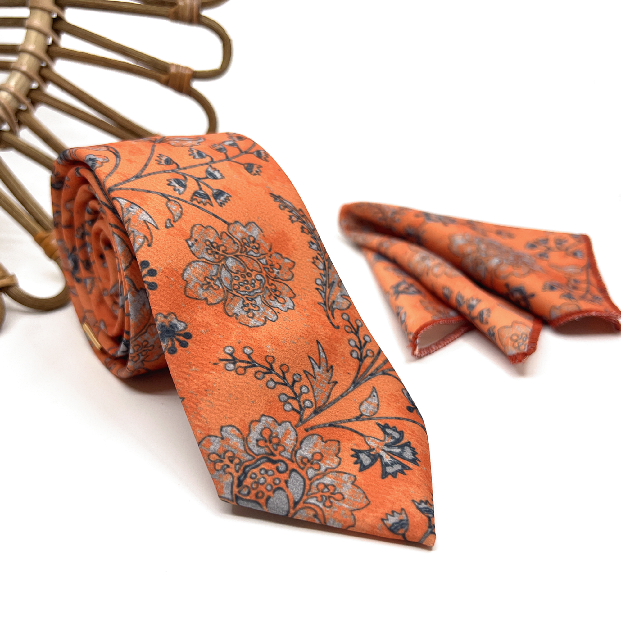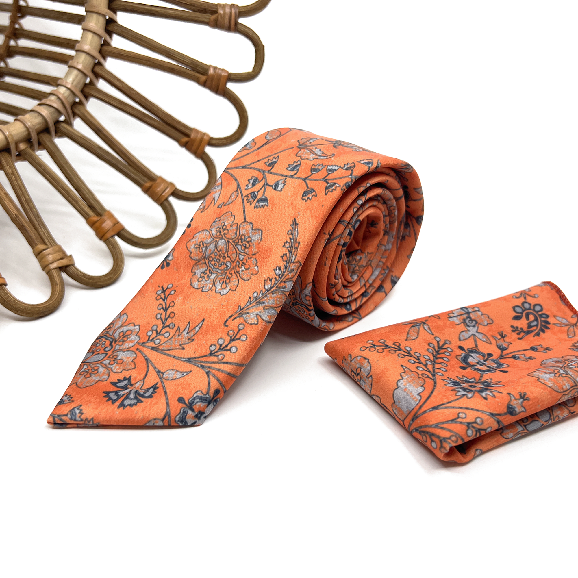 xBurnt Orange Floral Tie & Pocket Square Set – Wedding Necktie for Groom & Groomsmen