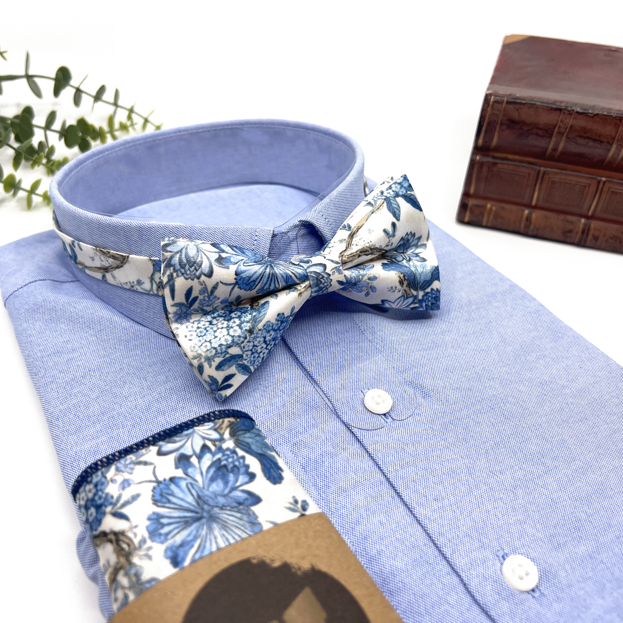 This meticulously handcrafted tie features delicate floral patterns in soft dusty blue hues, making it the perfect wedding accessory for grooms, groomsmen, and guests.
