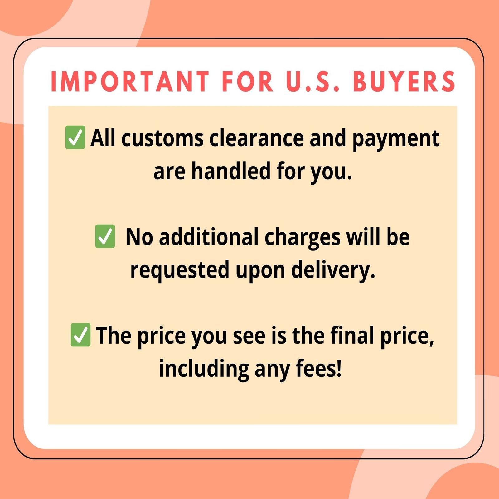 - U.S. Buyers: Starting August 29, new tax regulations require customs duties and paperwork for international orders. Don’t worry 💙—all customs clearance and payment will be handled on your behalf. The price you see is final, including all fees. No extra charges at delivery.